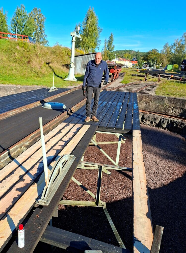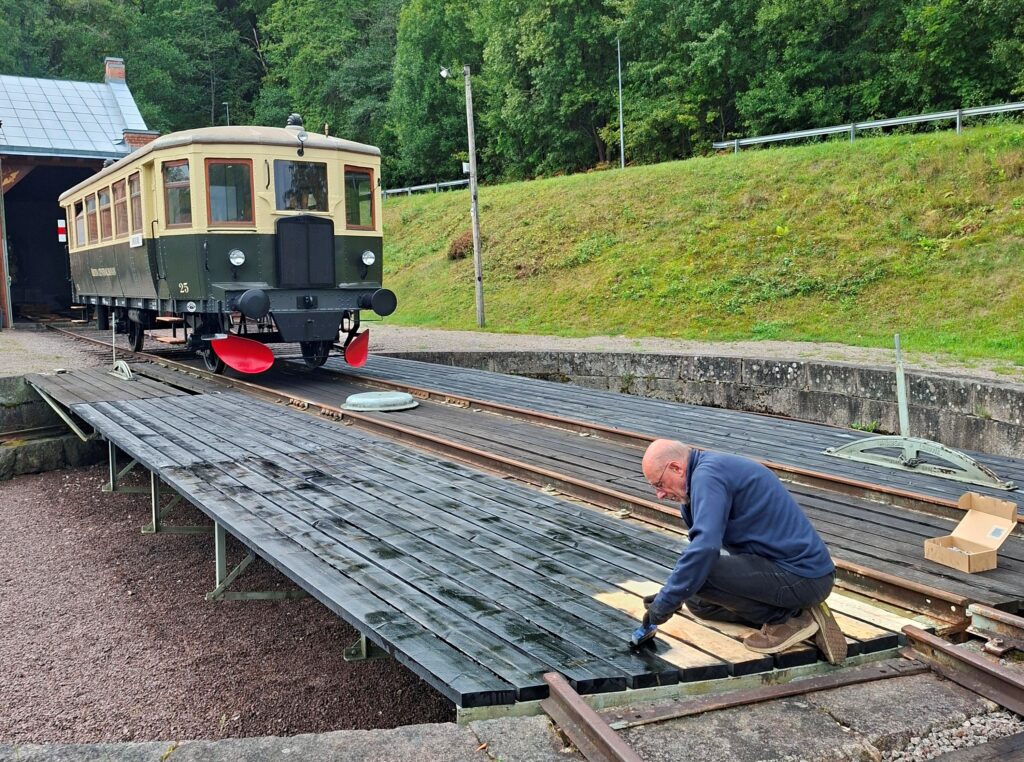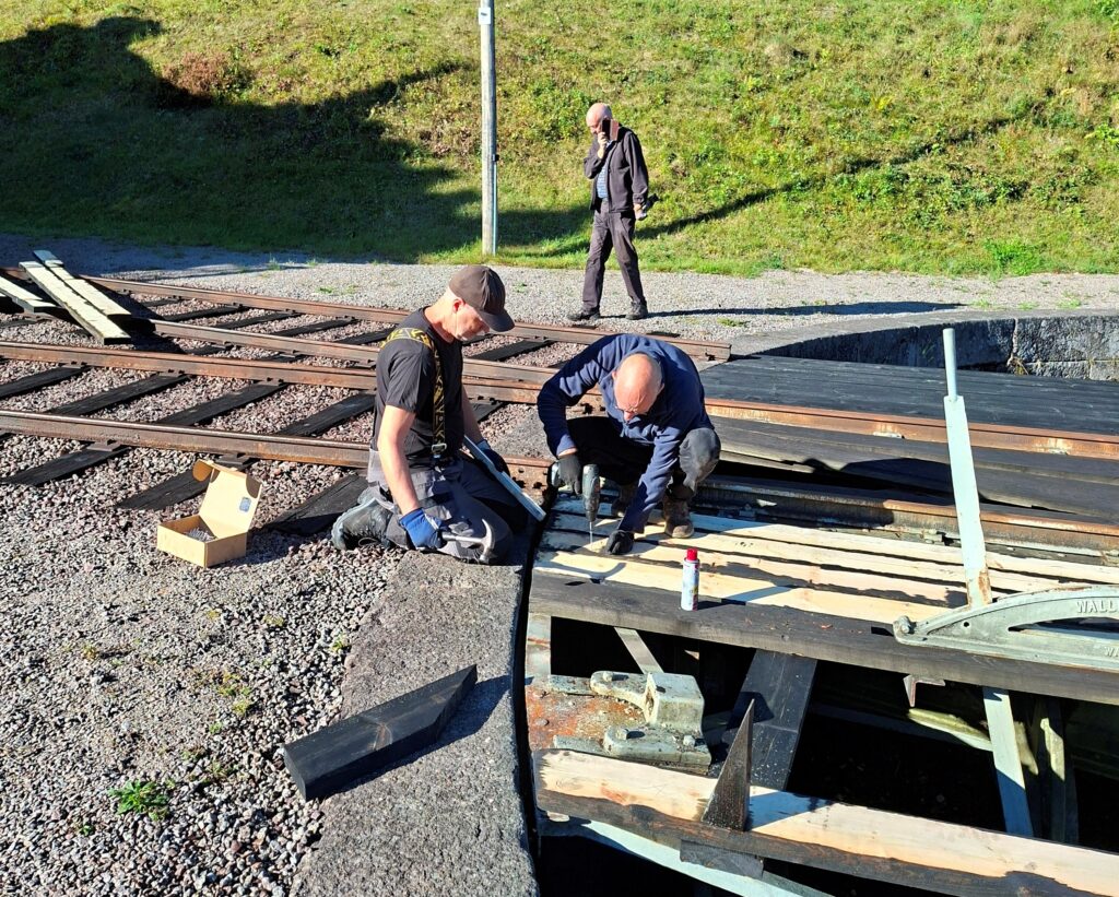 Arbetet med vändskivan fortskrider som planerat och nu är fyra av nio sektioner klara. Vi har påbörjat den femte. Arbetet flyter på bra men vi har för litet utrymme för att kunna torka bräderna så vi kan just nu bara ”processa” 20 plankor i taget i ”målningsfabriken”.